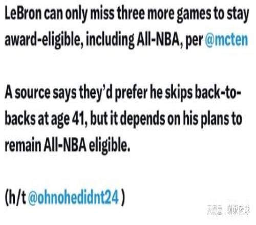 但对于詹姆斯来说,这需要做出很大牺牲,因为前面已经提到,如果詹姆斯背靠背真的缺席那么多比赛,除了全明星资格不受直接影响,除此之外重要奖项,他基本就别想拿了。所以若湖人当真如此,就不给詹姆斯背靠背两场全打,他个人奖项荣誉或许是四大皆空。