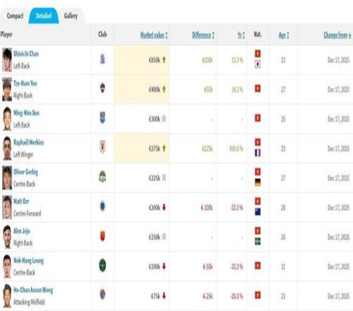 德转中超联赛中国香港球员身价榜