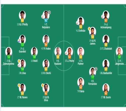 切尔西首发:12-约恩森、34-乔什·阿昌庞(62’21-哈托)、23-查洛巴、5-巴迪亚西勒、27-古斯托、24-詹姆斯、8-恩佐、41-埃斯特旺(46’17-桑托斯)、10-帕尔默、7-内托、20-若昂·佩德罗(62’9-德拉普)。