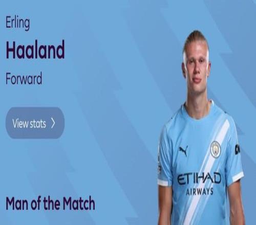 英超第21轮,曼城主场1-1战平布莱顿,此役打入一球的哈兰德当选全场最佳球员。