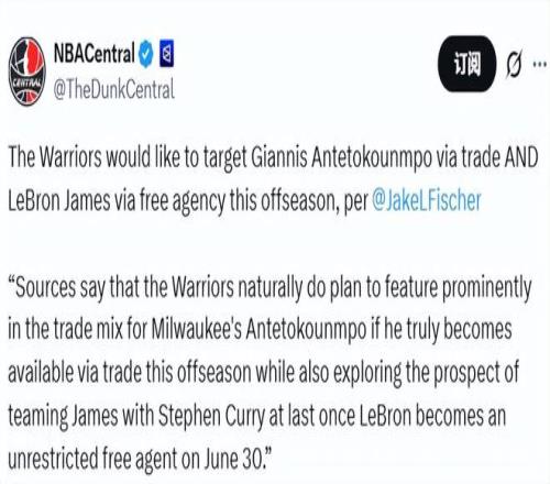 北京时间1月23日,据名记Fischer报道,消息人士透露,若雄鹿队球星字母哥进入交易市场,勇士队计划在今年休赛期全力参与关于他的交易谈判;同时,球队也在探讨另一种可能性——当詹姆斯于7月1日成为完全自由球员后,促成他与斯蒂芬-库里联手。勇士将这两位超级巨星视为足以改变球队未来走向的潜在引援人选。