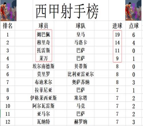 射手榜方面,姆巴佩19球继续领跑,穆里奇5球之差位列第2。托雷斯11球第3,莱万9球排在第4。亚马尔,阿尔瓦雷斯,拉菲尼亚等人7球刚好挤入前十。